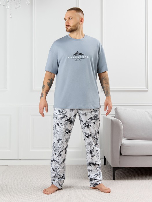 Костюм мужской, состоящий из футболки и брюк. Футболка однотонная с принтом на груди; модель свободная, со спущенной линией плеч, овальным вырезом горловины. Брюки из полотна с набивным рисунком эксклюзивного дизайна, прямые, с боковыми карманами с обтачными входами, на притачном поясе с отстроченной эластичной тесьмой.