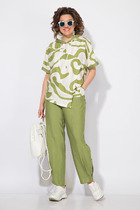 Костюм двухпредметный: состоит из джемпера и платья. Элегантный укороченный джемпер-кейп прямого свободного силуэта с округлой горловиной и фигурным лифом. Рукав втачной широкий, от линии локтя до запястья есть дополнительное отверстие для рук. Платье прямого силуэта, с небольшим расширением к низу, длиной макси. Перед с нагрудной вытачкой из бокового шва. Вырез горловины переда и спинки имеют V-образную форму.