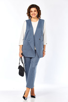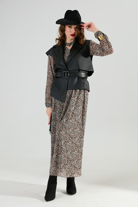 Костюм двухпредметный: состоит из платья и жилета. Платье макси прямого силуэта с V-образным вырезом, отрезное по линии талии. Горловине с имитацией чокера, застёжка на петлю и декоративную пуговицу. Рукав немного приспущен, по низу собран на манжет с петлей и пуговицей. Изделие на подкладке. Жилет из экокожи прямого силуэта с воротником пиджачного типа. По правой пройме переда расположена фигурная  деталь  "крылышко". Спинка со средним швом. По низу правого переда и низу правой спинки фигурная деталь. По левой части переда и левой части спинки отлетная кокетка. Изделие идёт в комплекте с ремнем из экокожи.