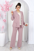 Костюм двухпредметный: состоит из блуза и брюк. Блуза прямого кроя с центральной застёжкой на петли и пуговицы. Вырез горловины глубокий округлый. Линия плеча приспущена. На рукавах изделия заложена декоративная сборка с регулируемыми завязками. В комплект к изделию идёт узкий пояс из основной ткани с авторским украшением ручной работы. Брюки свободного кроя, верхний срез представлен широкой резинкой, с карманами.
