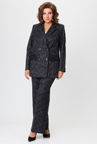Костюм трехпредметный: состоит из блузы, юбки и жилета. Блуза прямого кроя с центральной застёжкой на петли и пуговицы. Вырез горловины глубокий округлый. Линия плеча приспущена. На рукавах изделия заложена декоративная сборка с регулируемыми завязками (кулиса). Жилет удлиненный свободного прямого силуэта, воротник пиджачного типа. Линия низа по переду и спинке фигурная ассиметричная. Короткий рукав-крылышко. Талия фиксируется съемным ремнем из экокожи, для которого в боковых швах оформлены шлевки. Ремень идёт в комплекте к изделию. Юбка - солнце с узким поясом. В боковых швах расположены карманы. Застёжка на петлю и пуговицу и молнию по спинке.