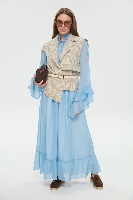 Костюм двухпредметный: состоит из платья и жилета. Платье макси свободного кроя с завышенной фигурной линией талии. Горловина оформлена воротником-стойкой с завязками, верхний край украшен рюшей. Рукав втачной широкий с асимметричными воланами по низу. Изделие на подкладке. Низ юбки оформлен воланом. Жилет прямого силуэта с воротником пиджачного типа. По правой пройме переда расположена фигурная деталь "крылышко". Спинка со средним швом. По низу правого переда и низу правой спинки фигурная деталь. По левой части переда и левой части спинки отлетная кокетка. Изделие идёт в комплекте с ремнем из экокожи.