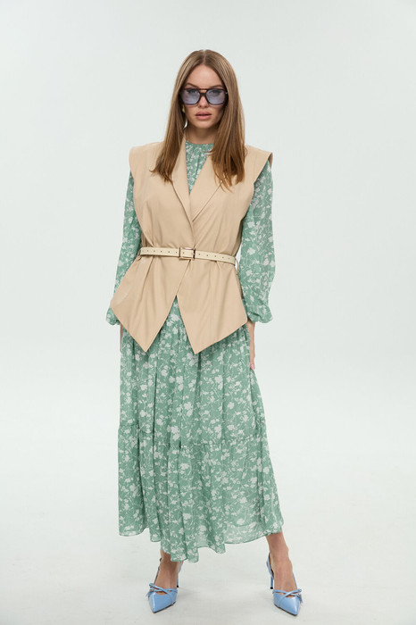 Костюм трёхпредметный: состоит из жилета, платья верхнего и нижнего. Платье состоит из двух платьев: верхнего и нижнего. Верхнее платье в пол свободного силуэта отрезное по линии бёдер. Перед лифа имеет расширение по низу. Горловина лифа собрана на сборку, оформлена вырезом по среднему шву и окантована бейкой, переходящей в завязки. Перед лифа цельный, имеет расширение по низу. Юбка платья имеет два яруса, которые собраны на сборку. Рукав объемный, одношовный. Низ рукава собран на сборку. Нижнее платье-комбинация на регулируемых бретелях. Жилет удлиненный свободного прямого силуэта, воротник пиджачного типа. Линия низа по переду и спинке фигурная ассиметричная. Короткий рукав-крылышко. Талия фиксируется съемным ремнем из экокожи, для которого в боковых швах оформлены шлевки. Ремень идёт в комплекте к изделию.