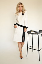 Элегантный костюм двухпредметный: состоит из кардигана и платья. Уютный кардиган свободного прямого силуэта длиной ниже линии бедер из приятной твидовой ткани в стиле "шанель". Изделие со съемным поясом на подкладке и накладными карманами с бахромой. Рукав втачной, двухшовный, пройма спущена на 3 см. Воротник английский. Застежка не предусмотрена. Трикотажное платье полуприлегающего силуэта с фигурным вырезом. Верхняя часть переда лифа (горловина) обработана обтачкой, в средней части лифа переда — фигурный вырез V-образной формы. Рукав фасона полуреглан. Длина изделия — миди. Изделие без подкладки.