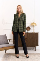 Костюм двухпредметный: состоит из джемпера и брюк. Джемпер комбинированный свободного силуэта с округлой горловиной. Рукав с передними и задними швами. Карманы в боковых швах. Брюки со стрелкой свободного кроя, верхний срез представлен широкой резинкой, с карманами.