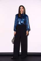 Костюм двухпредметный: состоит из джемпера и брюк. Джемпер свободного силуэта с округлой горловиной. Рукав комбинированного кроя, с передними и задними швами. Верхняя и нижняя часть рукава образуют между собой разрез. Карманы в боковых швах. По переду изделие декорировано фигурным бантом. Брюки со стрелкой свободного кроя, верхний срез представлен широкой резинкой, с карманами.