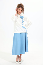 Костюм двухпредметный: состоит из джемпера и юбки. Джемпер из комбинированной ткани  свободного силуэта с округлой горловиной. Рукав с передними и задними швами. Верхняя и нижняя часть рукава образуют между собой разрез. Карманы в боковых швах.Роскошная юбка - солнце миди из облегчённого денима с узким поясом. В боковых швах расположены карманы. Застежка на кнопки с цельнокроеной планкой.  Длина  около 94 см. Изделие без подклада.