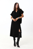 Костюм двухпредметный: состоит из джемпера и юбки. Джемпер объема оверсайз  прямого силуэта. По полочке и спинке вертикальные рельефы. Рукав длинный, широкий, покроя реглан. Воротник-стойка. Застежка центральная на молнию. По низу изделия протянут эластичный шнур с фиксатором. Юбка длиной миди прямая на резинке, немного расширенного силуэта. Разрез по переду. Изделие без подкладки.