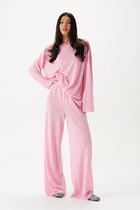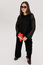 Костюм двухпредметный, состоит из брюк и жакета.  Жакет свободного прямого силуэта со слегка заниженной линией плеча. Однобортная застёжка на петли и пуговицы. По переду два больших накладных кармана. Воротник  шалевый цельнокроенный. Спинка с центральным швом. Изделие без подкладки. Брюки средней посадки, свободные вверху, слегка зауженные к низу с наклонными боковыми карманами.  Низ брючины ассиметричный. Пояс широкий отрезной, сзади на эластичной тесьме-резинке, по переду застежка на петли-пуговицы.