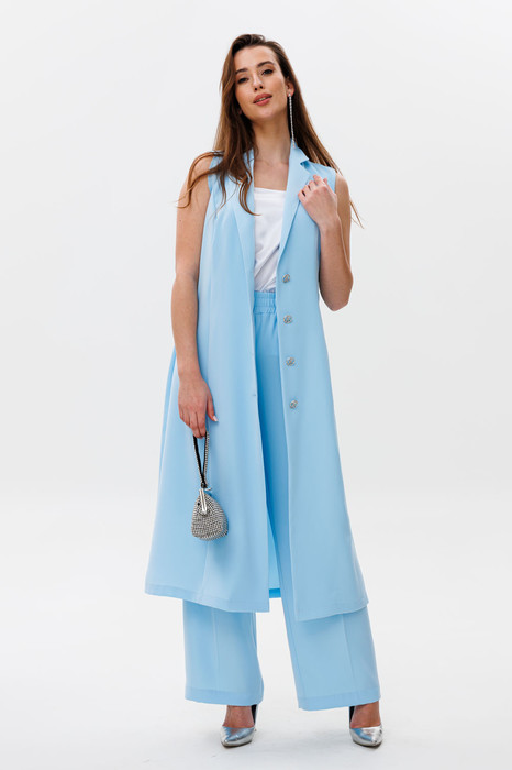 Костюм трехпредметный: состоит из топа, жилета-платья и брюк. Жилет удлиненный полуприлегающей силуэтной формы без рукавов. Полочка со смещённым бортовым краем назапах, с рельефными швами от линии плеча до низа. Застежка на петли и пуговицы. Спинка со средним швом и талиевыми вытачками. Воротник отложной с отрезной стойкой . Топ на регулируемых бретелях с полукруглым вырезом. Брюки свободного кроя, верхний срез представлен широкой резинкой, с карманами.