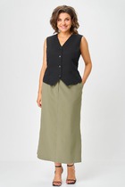 Костюм двухпредметный: состоит из жилета и брюк. Жилет прямого силуэта однобортный. Воротник пиджачного типа. Застежка на петлю и пуговицу. По краю изделия вставки из рубашечного хлопкового полотна не обработаны, создают имитацию многослойности. Широкие брюки с двойным поясом из отделочной контрастной хлопковой ткани. Изделие по линии талии на резинке с имитацией гульфика. Карманы с отрезным бочком.