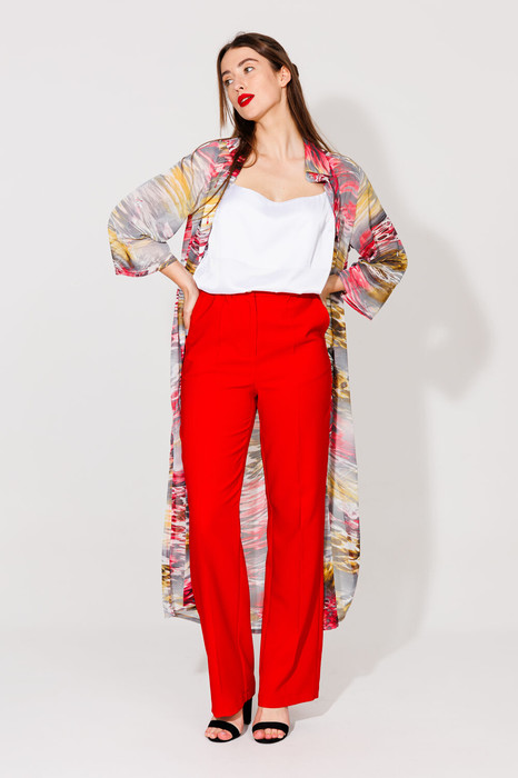 Костюм трехпредметный: состоит из топа, кардигана и брюк.Кардиган прямого кроя  с акцентным принтом. Горловина обработана рубашечным воротником с отрезной стойкой. Модель со слегка приспущенной линией плеча и рукавами длиной 7/8. Застёжка центральная на петли и пуговицы. По низу изделия разрезы. Топ на регулируемых бретелях с полукруглым вырезом. Брюки прямого кроя, с карманами.По переду боковой карман, застежка на тесьму-молнию и пуговицу. По спинке верхний срез  представлен резинкой.