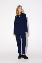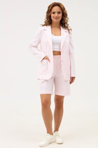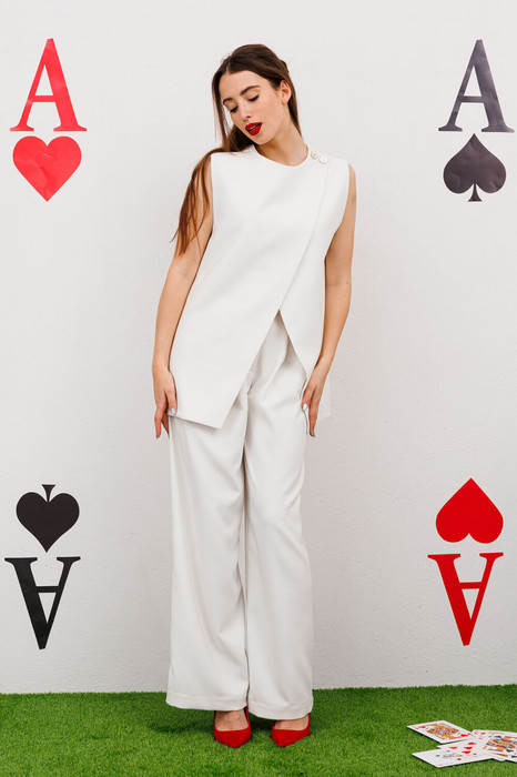 Костюм двухпредметный: состоит из жилета и брюк. Жилет назапах с полукруглым вырезом. Застёжка на петли и пуговицы на уровне плечевого шва. легантные брюки прямого кроя с боковыми карманами с отрезным бочком. Застежка на молнию и пуговицу. По переду - складки. Задние половинки с талиевыми вытачками и прорезными карманами с листочкой. Верхний срез обработан притачным поясом, по спинке на резинке.