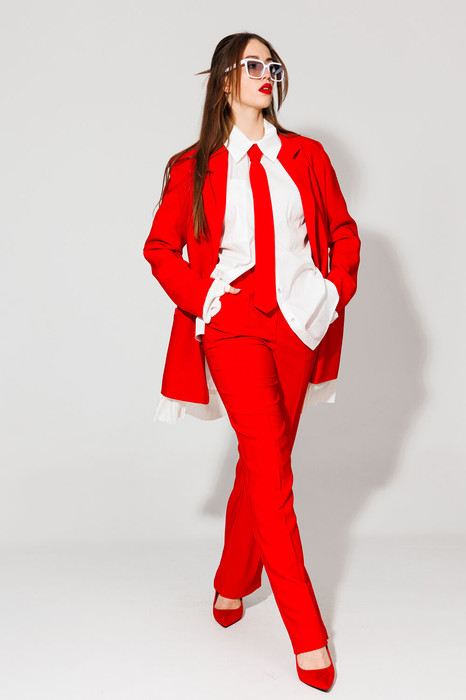 Костюм трехпредметный: состоит из брюк и жакета, галстука.  Жакет прямого силуэта на подкладке. Спинка со средним швом. На полочке нагрудная вытачка переведена в прорезной карман с клапаном и листочкой. Линия плеч расширена. Рукава втачные, длинные, двухшовные. Воротник отложной, пиджачного типа на отрезной стойке. Однобортная застежка на петли и пуговицы. Отделочные детали из трикотажного гофре по низу рукава и самого изделия создают имитацию рубашки.  Брюки прямого кроя, с карманами.По переду боковой карман, застежка на тесьму-молнию и пуговицу. По спинке верхний срез  представлен резинкой. Галстук классический на резинке станет отличным дополнением к комплекту.