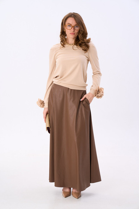 Костюм двухпредметный: состоит из джемпера и юбки. Уютный джемпер с округлой горловиной. Защипы на рукаве-реглане делают образ максимально женственным и элегантным. На рукавах есть съёмные авторские украшения в виде цветка из основной ткани. Юбка - солнце макси с узким поясом. В боковых швах расположены карманы. Застёжка на петлю и пуговицу и молнию по спинке.