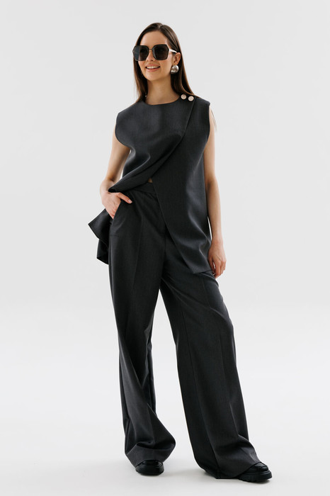 Костюм двухпредметный: состоит из жилета и брюк. Жилет назапах с полукруглым вырезом. Застёжка на петли и пуговицы на уровне плечевого шва. Брюки прямого кроя. На передних половинках брюк карманы с наклонным входом и отрезной боковой частью. Пояс притачной, подкройной. Линия талии приспущена.