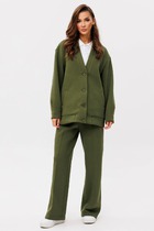 Костюм двухпредметный: состоит из жакета и брюк. Жакет рубашечного типа прямого силуэта с асимметричным низом. Рукав втачной со спущенной линией плеча, фиксируется на пату. Застежка центральная на петли и пуговицы, смещённая по косой. На левой полочке накладной карман с клапаном. Воротник отложной на стойке до половины спинки. Брюки свободного кроя из гладкой ткани сочетают элегантность и комфорт. Широкая резинка на поясе и наличие функциональных карманов подчеркивают удобство модели.
