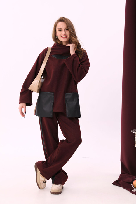 Костюм комбинированный двухпредметный: состоит из джемпера и брюк. Джемпер прямого свободного силуэта длиной до линии бедер, воротник хомут, рукав одношовный, втачной длиной до запястья. Спинка цельнокроеная. Перед состоит из двух частей- верхней и нижней. По нижней части переда сверху по центру вставка из отделочной ткани. По нижней части переда боковые накладные карманы из отделочной ткани, уходяшие в боковой шов, длинее линии низа переда вровень с линией низа спинки.  Брюки прямого силуэта с наклонными карманами к боковым швам и  лампасами из отделочной ткани. Пояс на резинке.