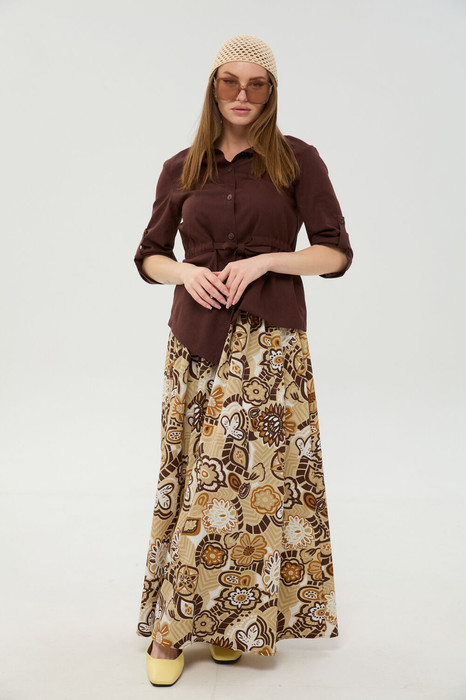 Костюм двухпредметный: состоит из жакета и юбки. Жакет прямого силуэта, воротник пиджачного типа, рукав одношовный, втачной с незначительно спущенной линией плеча, длиной три четверти, с патой. По линии ткани настрачная кулиса с завязками из основной ткани. Застежка центрально-бортовая. Линия низа верхней части фигурная ассиметричная. Юбка - солнце макси с узким поясом на резинке.