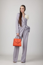 Костюм комбинированный двухпредметный: состоит из жакета и юбки. Жакет рубашечного типа прямого силуэта с асимметричным низом. Рукав втачной со спущенной линией плеча, фиксируется на пату. Застежка центральная на петли и пуговицы, смещённая по косой. На левой полочке накладной карман с клапаном. Воротник отложной на стойке до половины спинки. Юбка - солнце макси с узким поясом. В боковых швах расположены карманы. Застёжка на петлю и пуговицу и молнию по спинке.