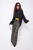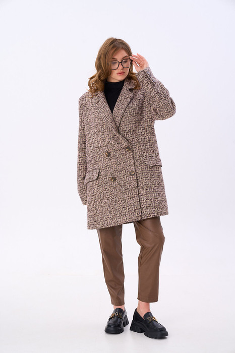 Костюм двухпредметный: состоит из жакета и брюк. Жакет оверсайз прямого силуэта на подкладке. Застежка бортовая на петли и пуговицы. Детали переда с двумя вытачками и с карманами. Карман прорезной с обтачками и клапаном. Карман с наклонным входом, прорезной, с листочкой. Спинка со средним швом. В среднем шве спинки шлица. Рукав втачной, длинный, двухшовный, с открытой шлицей в локтевом шве. Воротник английский с отрезной стойкой. Брюки с притачным поясом и с карманами в боковых швах..