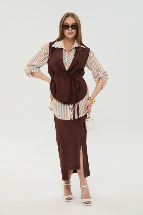 Костюм трёхпредметный: состоит из рубашки, жилета и юбки. Рубашка прямого силуэта с притачной планкой с застёжкой на петли и пуговицы. Рукав втачной одношовный со спущенной линией плеча с патой. Воротник рубашечный стояче-отложной. Перед состоит из трёх частей : центральная часть ,верхняя часть и нижняя часть. Спинка состоит из двух частей . Линия низа фигурная с широкой окантовкой. Жилет съёмный прямого силуэта без застёжки, воротник пиджачного типа. Линия низа фигурная, в комплект идёт пояс из основной ткани. Юбка длиной миди, расклешенная к низу, с асимметричным низом. Пояс притачной, по спинке собран на резинку. Переднее полотнище состоит из трех частей. Правая часть скреплена отделочной строчкой и кнопками. В боковых швах изделия расположены карманы. По спинке изделия идёт средний шов и две вытачки для удачной посадки по фигуре. Юбка без подкладки.