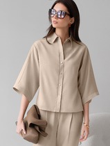 Костюм двухпредметный: состоит из жакета и юбки. Жакет рубашечного типа прямого силуэта с асимметричным низом. Рукав втачной со спущенной линией плеча, фиксируется на пату. Застежка центральная на петли и пуговицы, смещённая по косой. Воротник отложной на стойке до половины спинки.Юбка длиной миди, расклешенная к низу, с асимметричным низом. Пояс притачной, по спинке собран на резинку. Переднее полотнище состоит из трех частей. Правая часть скреплена отделочной строчкой и кнопками. В боковых швах изделия расположены карманы. По спинке изделия идёт средний шов и две вытачки для удачной посадки по фигуре. Юбка без подкладки.