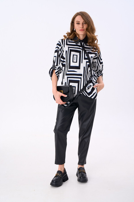 Костюм двухпредметный: состоит из жакета и брюк. Жакет рубашечного типа прямого силуэта с асимметричным низом. Рукав втачной со спущенной линией плеча, фиксируется на пату. Застежка фигурная на петли и пуговицы, смещённая по косой. Воротник рубашечный. Брюки с притачным поясом и с карманами в боковых швах.