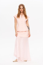 Комплект брючный 2-х предметный, состоящий из блузки и брюк. Блузка полуприлегающего силуэта, выполнена из вискозного полотна. Модель с плечевыми накладками и разрезами в боковых швах. Перед декорирован вставками с застроченными вертикальными защипами и отрезными фигурными планками, застегивающимися на 3 петли и 3 пуговицы. От планок к швам притачивания вставок направлены навесные петли, застегнутые на пуговицы. Спинка со средним швом; круглая горловина спинки обработана отрезной фигурной бейкой. Рукав короткий, втачной. Длина блузки – 66,5 (46-50 р-р) см, 69 см (52-60 р-р); длина рукава – 19,5 см (46-50 р-р), 20,0 (52-60 р-р) см. Брюки классические, с посадкой на талии, выполнены из вискозного полотна. Модель с центральной застёжкой на тесьму-«молнию», на притачном поясе, застегивающемся на петлю и пуговицу. Передние и задние половинки брюк с талиевыми вытачками, направленными от пояса вниз. Спереди обработаны боковые наклонные карманы. Для лучшего прилегания брюк в области талии в поясе по задним половинкам вставлена эластичная лента. Длина брюк по боковому (с поясом) – 101,5 см (46-50 р-р), 102,5 см (52-54 р-р), 103,5 см (56-60 р-р).