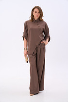 Комплект брючный 2-х предметный, состоящий из блузки и брюк. Блузка полуприлегающего силуэта, выполнена из вискозного полотна. Модель с плечевыми накладками и разрезами в боковых швах. Перед декорирован вставками с застроченными вертикальными защипами и отрезными фигурными планками, застегивающимися на 3 петли и 3 пуговицы. От планок к швам притачивания вставок направлены навесные петли, застегнутые на пуговицы. Спинка со средним швом; круглая горловина спинки обработана отрезной фигурной бейкой. Рукав короткий, втачной. Длина блузки – 66,5 (46-50 р-р) см, 69 см (52-60 р-р); длина рукава – 19,5 см (46-50 р-р), 20,0 (52-60 р-р) см. Брюки классические, с посадкой на талии, выполнены из вискозного полотна. Модель с центральной застёжкой на тесьму-«молнию», на притачном поясе, застегивающемся на петлю и пуговицу. Передние и задние половинки брюк с талиевыми вытачками, направленными от пояса вниз. Спереди обработаны боковые наклонные карманы. Для лучшего прилегания брюк в области талии в поясе по задним половинкам вставлена эластичная лента. Длина брюк по боковому (с поясом) – 101,5 см (46-50 р-р), 102,5 см (52-54 р-р), 103,5 см (56-60 р-р).