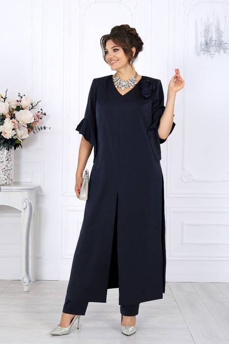 Туника полуприлегающего силуэта, выполнена из костюмно-плательного сатина. Модель без подкладки, с плечевыми накладками. Перед с нагрудными вытачками, направленными от пройм, и средним швом, в нижней части которого обработан разрез. Спинка с талиевыми вытачками и средним швом, в верхней части которого расположена застежка на потайную тесьму-«молнию», в нижней части-разрез. Ширина отделочной строчки по центральным разрезам переда и спинки – 4 см. В боковых швах высокие разрезы расположены от уровня талии до низа. Ширина отделочной строчки по боковым разрезам – 1 см. V-образный вырез горловины переда переходит в округлый по спинке. Рукав втачной, с асимметричным обтачным воланом по низу. Туника дополняется съемным декоративным цветком «роза», выполненным из основной ткани. Длина туники – 133,5 см (46-52 р-р), 135 см (54-62 р-р).