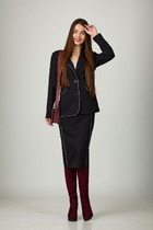 Комплект брючный 3-х предметный, состоящий из кардигана, блузки и брюк; выполнен из костюмно-плательной ткани и гипюра.