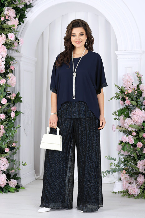 Свободная блузка из шифона стрейч мягко струится по фигуре, визуально вытягивает силуэт и деликатно скрывает зону живота и бёдер. Декоративные элементы из сетки-гофре с люрексом придают образу благородное сияние и делают костюм по-настоящему вечерним.