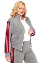 Жакет отрезной по линии талии, выполнен из трикотажного полотна с фактурной лицевой стороной «люрекс». Модель на подкладке, с плечевыми накладками; без воротника, с V-образным вырезом горловины. В верхней части переда заложены 3 односторонние складки, направленные от талии к центру груди, и 3 односторонние складки на баске, направленные к низу. На спинке обработаны талиевые вытачки. Борта и горловина оформлены отрезной планкой. Жакет с однобортной застежкой на 5 прорезных петель и 5 пуговиц, обтянутые основным материалом. Рукав длинный, втачной. Длина жакета-68 см. Длина рукава-61 см.
