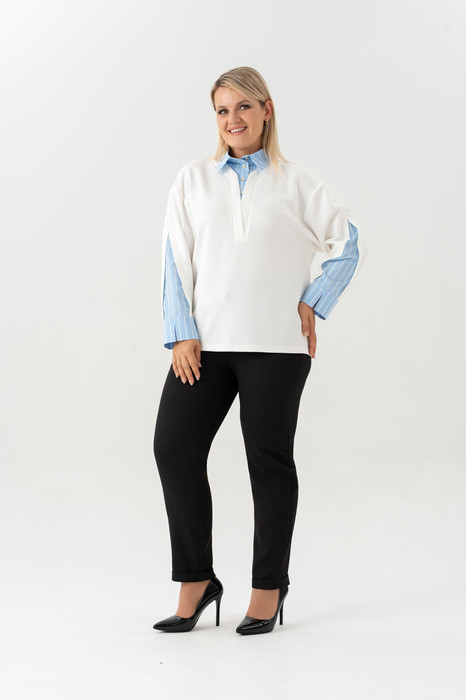 Практичный и удобный – он станет Вашим любимым костюмом, а трендовый дизайн делает его актуальным решением для девушек, которые следят за модой. Свитшот женский с имитацией рубашки- новинка коллекции. Изготовленный из качественного трикотажа и полоски на х/б основе, он обеспечивает дышащие свойства и гипоаллергенность, что особенно важно для женщин с чувствительной кожей. Подходит на осень, весну и для зимы. Ткань необычайно мягкая и приятная к телу. Свободный оверсайз крой изумительно подойдет для девушек и женщин больших размеров. На свитшоте обработан воротник и  застежка –планка на петли и пуговицы. Рукав комбинирован из двух тканей, с манжетой и разрезом. Модель подходит для высоких и для невысоких. Брюки с удобной ,высокой посадкой и боковыми карманами позволяют хранить мелкие вещи, такие как ключи или смартфон, что делает этот костюм не только стильным, но и практичным. По низу брюк обработаны манжеты. Пояс частично на резинке, застежка на молнию и петлю  с пуговицей.