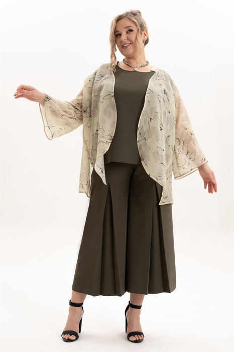 Прекрасный комплект, в состав которого входят брюки кюлоты, блуза и шифоновый кардиган. Лёгкая удлинённая накидка, блуза и кюлоты подходит для девушек любого возраста. Это универсальный комплект, который станет незаменимым в вашем гардеробе. Костюмная ткань, c которой пошиты кюлоты с хорошим стрейч-эффектом добавит комфорта при носке изделия. Кюлоты выполнены в стиле палаццо с укорочённой длиной, что делает её идеальной для любой поры года. Кардиган из шифона свободного силуэта с воротником стойка. В комплект к накидке идёт съёмный пояс. В боковых швах накидки есть небольшие, слегка переходящие на перёд разрезы. Блуза выполнена с приятной на ощупь ткани. Спущенная линия плеча в сочетании с круглой горловиной невероятно женственная и изящна. В боковых швах также есть разрезы. Удобные и комфортные брюки кюлоты в этом комплекте- незаменимая в гардеробе вещь, которая подчеркнёт всю утончённость женской натуры и позволит всегда чувствовать себя комфортно. Перёд с застёжкой «молния», карманами в боковых швах, по линии предполагаемой стрелки разведена встречная складка, которая застрочена до линии бедра. Пояс в области боковых швов дополнен эластичной тесьмой. Они идеально сидят на фигуре благодаря свободной резинке, завышенной посадке. Укорочённый свободный крой брюк прекрасно сочетается с различными верхами, позволяя создать повседневные, так и более нарядные образы на свадьбу, день рождения и другие торжества,