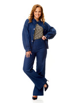 Брюки расширены к низу. На передней и задней половинках отстрочены стрелки до контрольных точек. На задней половинке расположена наклонная кокетка и накладные карманы. На подзоре правого переднего кармана расположен накладной маленький карман. Верхний срез обработан поясом со шлевками.