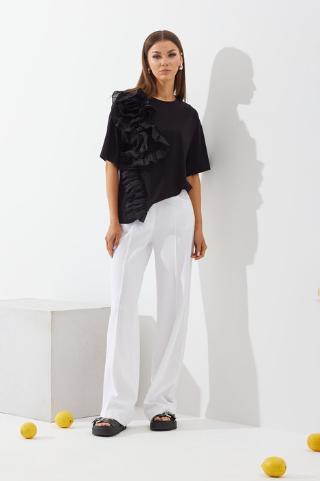 Блуза выполнена из трикотажного полотна. Прямая, свободной формы, покроя спущенное плечо. Горловина округлой формы, оформлена планкой из основной ткани, рукав одношовный короткий. На правой части переда настрочена аппликация  в виде цветка из отдельной ткани (текстильного хлопка в цвет модели).