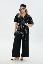 Комплект трехпрехпредметный, состоит из блузы, топа (бандо) и брюк. Выполнен из кружевного полотна.
