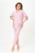Брюки по форме прямые с заутюженными стрелками. Верхний срез обработан поясом с резинкой по спинке и переду до центральной части пояса. На задней левой половинке расположена имитация кармана в рамку. На передних половинках расположены наклонные карманы, имитация застежки на гульфик.