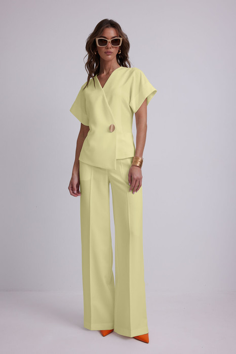 Брюки прямые, свободные. Верхний срез оформлен поясом, застегивающимся на петлю-пуговицу. На поясе шлевки, застежка с гульфиком на тесьму-молнию. В боковых швах выполнены наклонные карманы. На задней правой половинке брюк выполнен прорезной карман в рамку с петелькой и пуговицей отделочной (карман не функциональный)