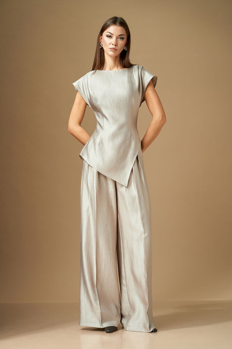 Брюки свободной формы с манжетами, слегка расширены книзу. Верхний срез оформлен цельнокроеным поясом. В боковых швах передних половинках расположены наклонные карманы. В брюках заутюжены стрелки. На передних половинках расположены складки, направленные к боковому шву, на задней правой половинке расположена «имитация» кармана в рамку с пуговицей, а так же талиевые вытачки. На передних половинках застежка на гульфик.