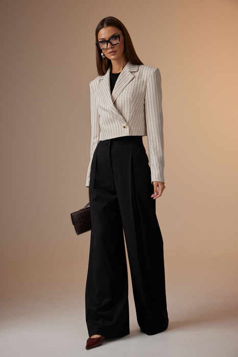 Комплект женский, состоит из жакета в полоску и брюк из однотонной костюмной ткани, а так же топа из трикотажного полотна.