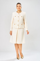 Жакет приталенного силуэта с центральной бортовой застежкой на петли-пуговицы, низ борта скошен. По переду рельеф из проймы, переходящий в прорезной карман с листочкой, выкроен по косой. Горловина не глубокая, округлой формы. Спинка со средним швом, отрезным бочком и талиевыми вытачками. Рукав втачной, длинный, двухшовный. Жакет на подкладке.