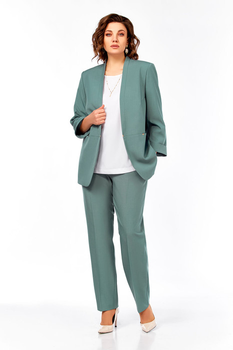 Комплект повседневный, состоит из жакета, блузки и брюк. Жакет полуприлегающего силуэта без застежки, с закругленными бортами. Перед с нагрудными вытачками, горизонтальный подрез ниже талии, в котором расположены функциональные карманы. Вдоль борта отрезная планка, переходящая воротник-стойку. Декоратиные украшения под золото. Спинка со средним швом. Рукав двухшовный с притачной манжетой. Перед и спинка на подкладке. Брюки заужены к низу, на поясе, частично на резинке. Карманы в боковых швах. По переду и спинке заутюжены стрелки. Блузка с округлым вырезом горловины, со спущенной линией плеча.