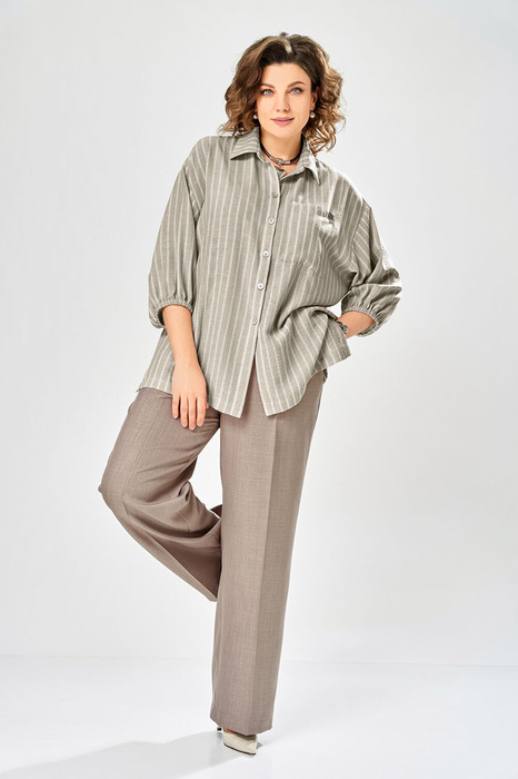 Интересный комплект, состоящий из блузы свободного силуэта и брюк прямого кроя. Блуза с центральной застежкой на петли и пуговицы, воротником рубашечного типа. Рукав спущенный, по низу резинка, длина 3/4. Слева накладной карман, разрезы в боковых швах. Брюки со стрелками, карманы в боковых швах, пояс частично на резинке.