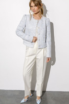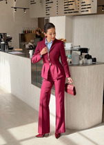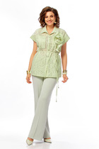Интересный легкий костюм, состоит из блузы и брюк. Блуза полуприлегающего силуэта, с округлым вырезом горловины. Нагрудные вытачки, слева заложена декоративная складка с пришитыми пуговицами и отделочной нашивкой. Спинка со средним швом и застежкой на петлю и пуговицу. Разрезы в боковых швах. Рукав короткий, по центру со складкой и пуговицей. Брюки прямого силуэта, с карманами в боковых швах. Пояс притачной, частично на резинке. На левом полотнище обносторонняя складка от пояса до низа с пришивными декоративными пуговицами.