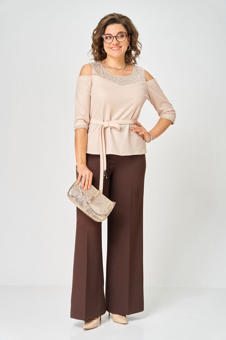 Комплект женский, состоящий из блузы трикотажного полотна с блеском и отделкой пайетки и брюк из костюмной ткани.