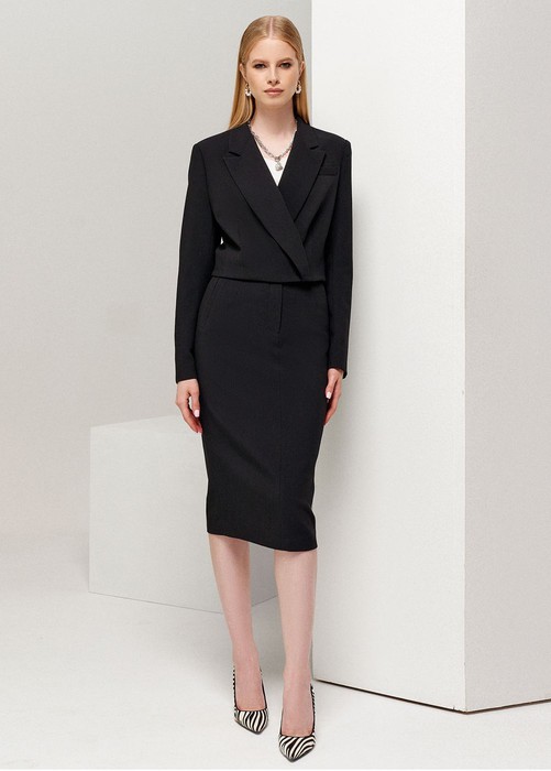 Элегантный офисный костюм послужит вам для создания стильных образов. Его уместно надеть на работу, учебу, деловую встречу, конференцию, бизнес-ланч. Модель изготовлена из плотной поливискозной ткани. Укороченный жакет и юбка-карандаш длиной ниже колена скроены в прямом силуэте, отлично садятся по фигуре. Пиджак с английским воротником и нагрудным карманом подчеркивает официальный стиль комплекта. Юбка с молнией в гульфике дополнена карманами-обманками.
