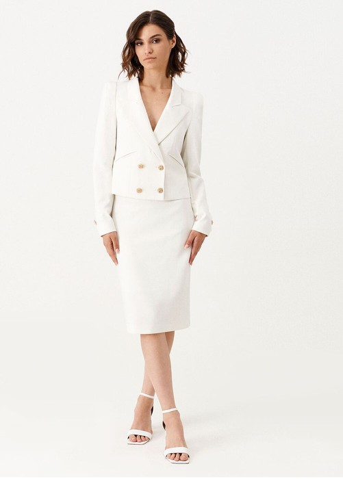 Стильный женский костюм с жакетом и юбкой решит вопрос с созданием образов в официальном стиле. Трикотажный костюм женский хорошо подойдет для прохладного лета и межсезонья. Укороченный жакет с двубортным воротником украшен четырьмя пуговицами, по две в ряд. Дополняет его прямая юбка длиной до колена. Костюм пиджак и юбка женские можно носить самостоятельно или сочетать с майками, футболками, блузками. Для завершения строгих образом подойдут туфли-лодочки на каблуке. Закажите классический юбочный костюм по выгодной цене уже сегодня.